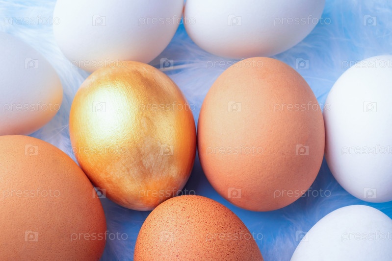 Вид сверху и плоская кладка золотого, коричневого и белого куриного яйца с перьями на синем фоне. Концепция инвестиций, финансового успеха, лидерства в бизнесе