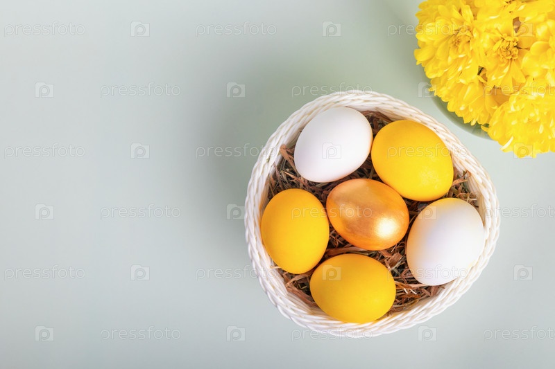 Вид сверху на плетеную белую корзину с сеном, окрашенные золотые, желтые и белые яйца с букетом ярких цветов хризантем. Пасхальный фон