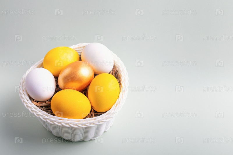 Плетеная белая корзина с сеном, расписными золотыми, желтыми и белыми яйцами. Деревенский, минималистичный и простой пасхальный фон. Копировать пространство