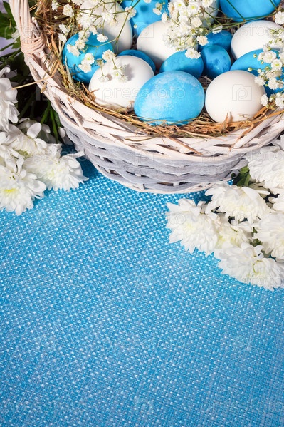 Крупный план голубых и белых куриных яиц в плетеной корзине с сеном. Пасхальный сельский и деревенский фон