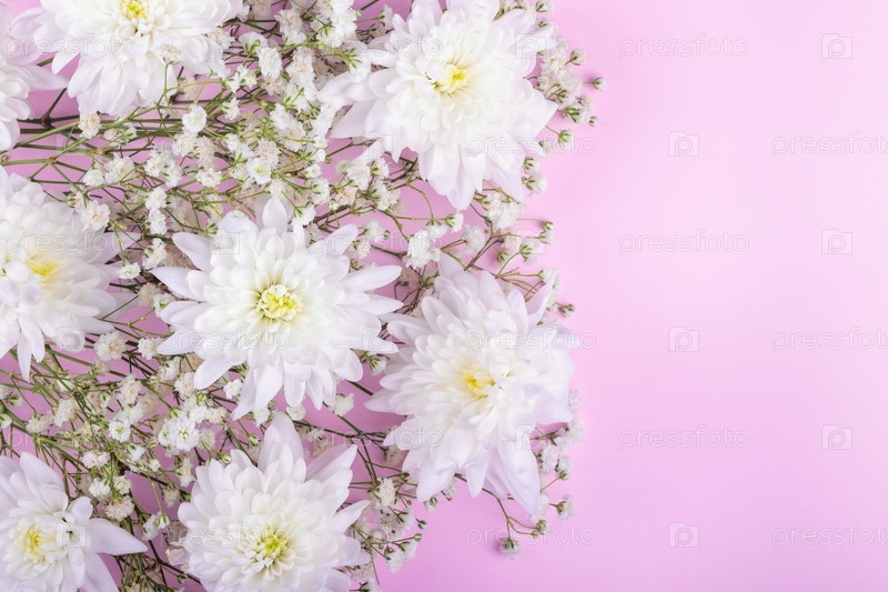 Крупным планом букет белых цветов хризантемы на фиолетовом фоне. Вид сверху и плоская планировка. Скопируйте пространство. Весенний и пасхальный минималистичный фон