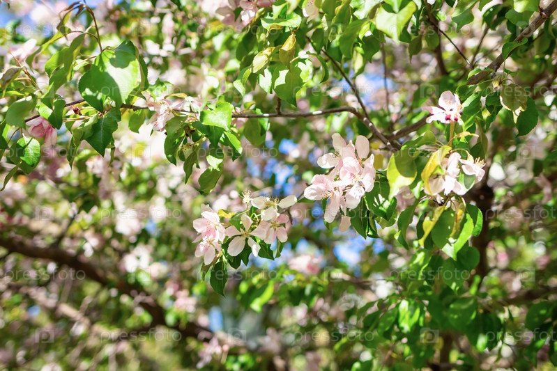 Белые и розовые цветы на ветвях яблони в саду. Красивый и нежный весенний фон. Яркий солнечный день в цветущем фруктовом саду