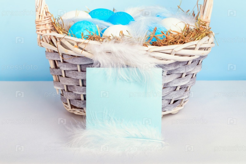 Синий лист бумаги рядом с плетеной корзиной с сеном, окрашенными в синий и белый цвета яйцами и перьями Пасхальный фон
