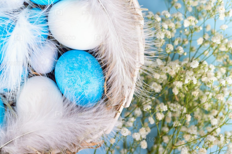 Крупный план голубых и белых крашеных яиц в плетеной корзине с сеном, украшенных перьями на фоне весенних цветов. Пасхальный фон