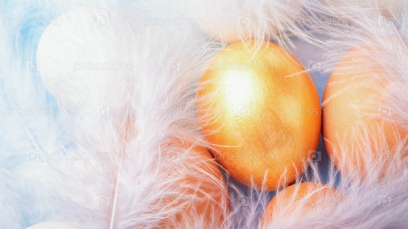 Золотое, коричневое и белое куриное яйцо с перьями. Концепция инвестиций, финансового успеха, роскошных сокровищ и сбережений