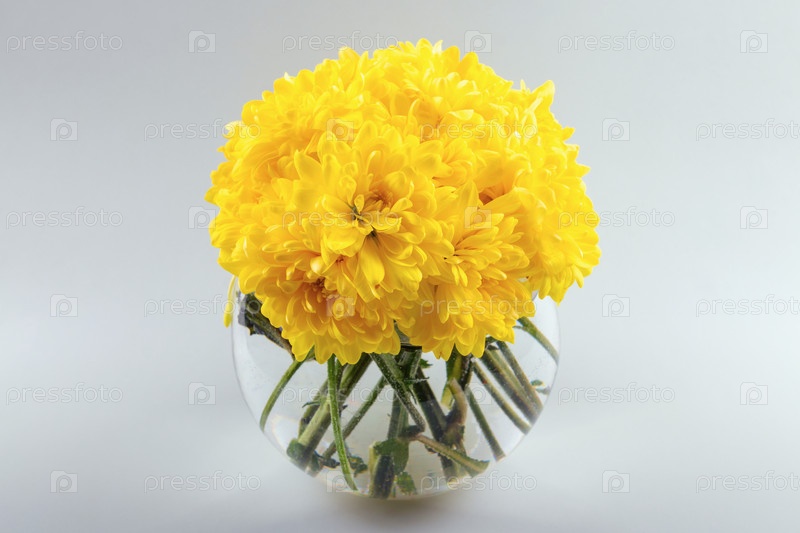 Небольшой букет ярко-желтых цветов хризантемы в круглой стеклянной вазе