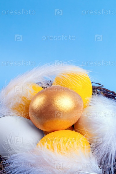 Крупный план золотых, желтых и белых яиц, украшенных перьями на синем фоне. Пасхальный финансовый вертикальный фон