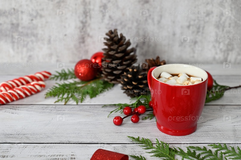 Рождественская открытка с игрушками, еловыми ветками и гирляндой. Декор сладостями, корицей