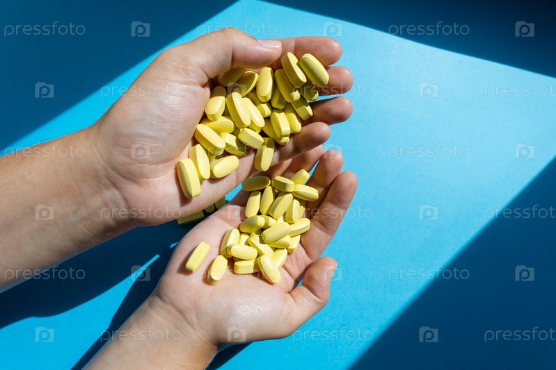 Руки доктора держат много витаминных капсул или таблеток с лекарствами. Здравоохранение или медицинская концепция