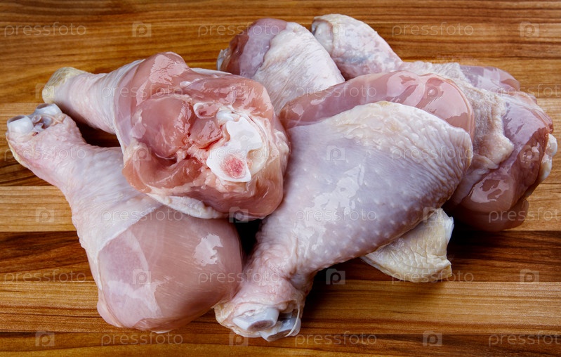 Куча сырых куриных ножек на деревянной доске. Вид сверху