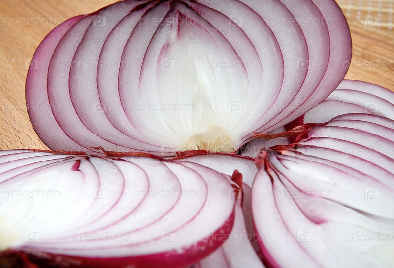 Нарежьте сочный лук на деревянной доске крупным планом