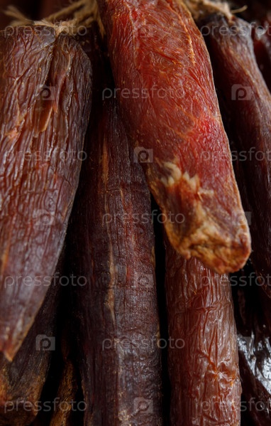 Связка колбасок , копченое и вяленое мясо