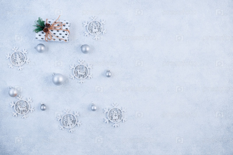 Концепция праздничного фона в серебристых тонах. Вид сверху на серебряные шарики из подарочной коробки на сером фоне. Макет фона новогодних праздников с местом для копирования