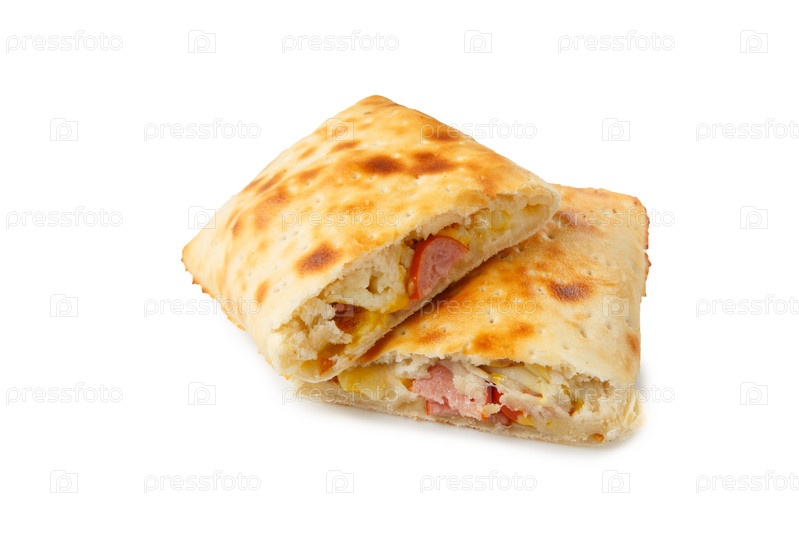 Пищевая фотография пирога с сосисками, красным луком, помидорами и сыром на белом фоне