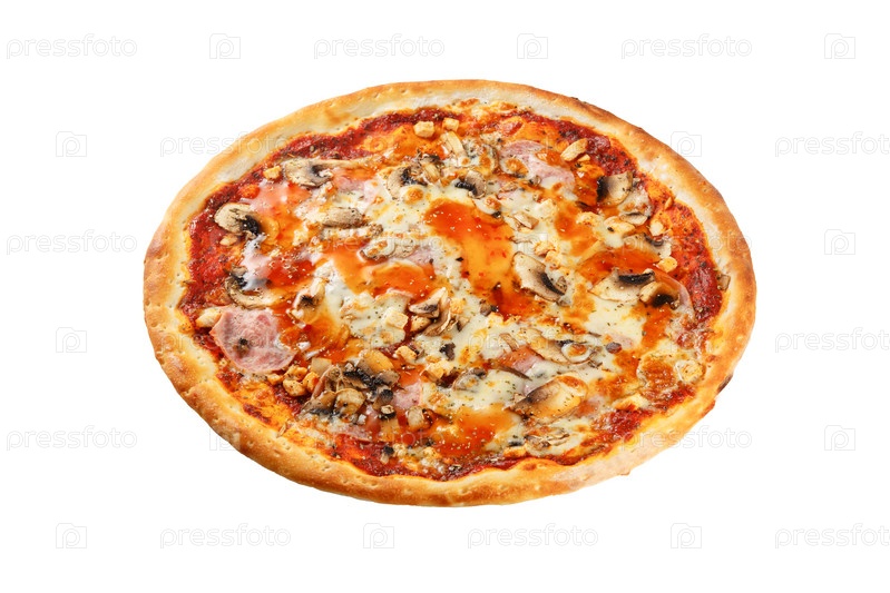 Вкусная классическая итальянская пицца с моцареллой, ветчиной, курицей и грибами на белом фоне. Вид сбоку