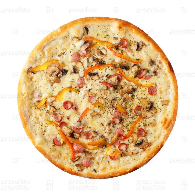 Вкусная классическая итальянская пицца с моцареллой, паприкой, колбасой пепперони и грибами на белом фоне. Вид сверху