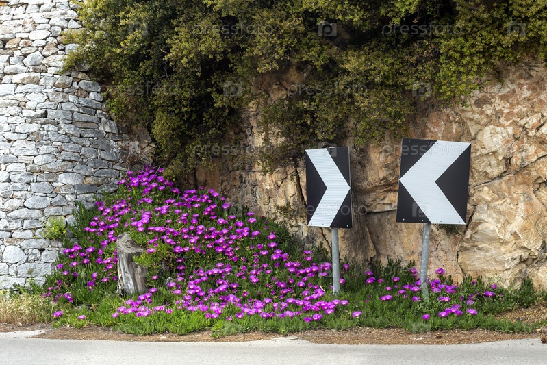 Дорожный знак и растение (Carpobrotus edulis) растут в крупном плане