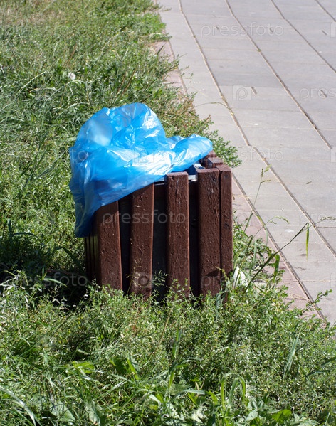 Мусорный ящик в парке в сухой солнечный летний день