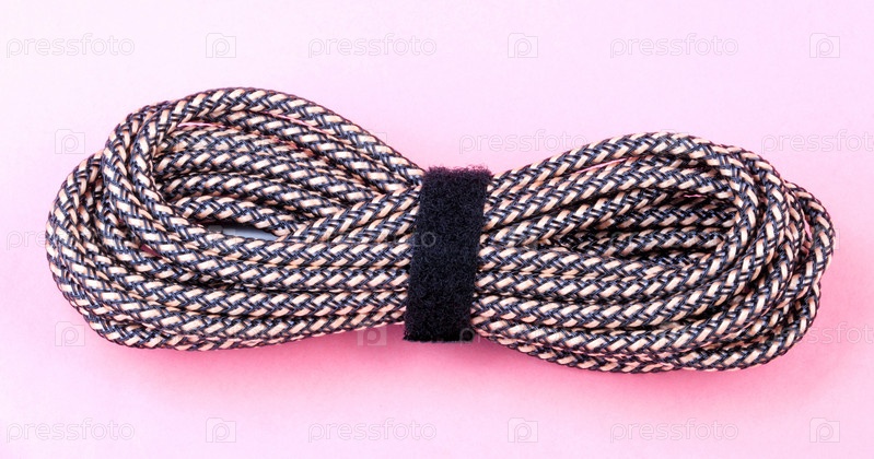 Коричневый аудиокабель Aux Stereo на розовом фоне