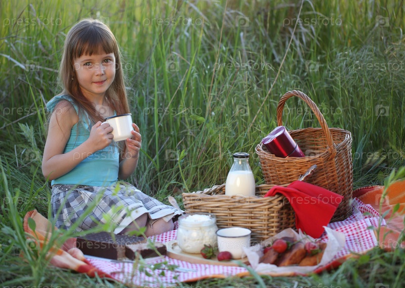 Девочка держит бутылку с молоком. Пикник