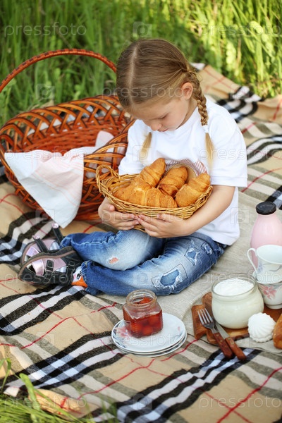 Девочка сидит на пледе в парке на пикнике