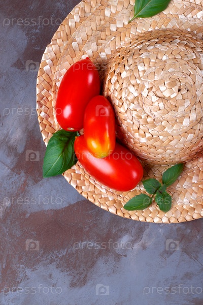 Спелый помидор сливы на соломенной шляпе на сером столе. Органические сельскохозяйственные овощи