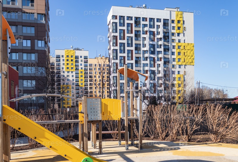 Детская площадка во дворе жилого массива в солнечный весенний день. Жилой комплекс «В лесу», Москва, Россия
