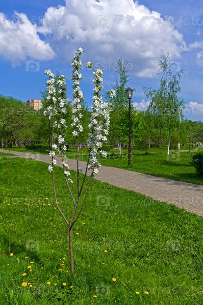 Маленькая цветущая яблоня. Яблоневый сад в Коньково, Юго-Западный административный округ Москвы, солнечный день в мае