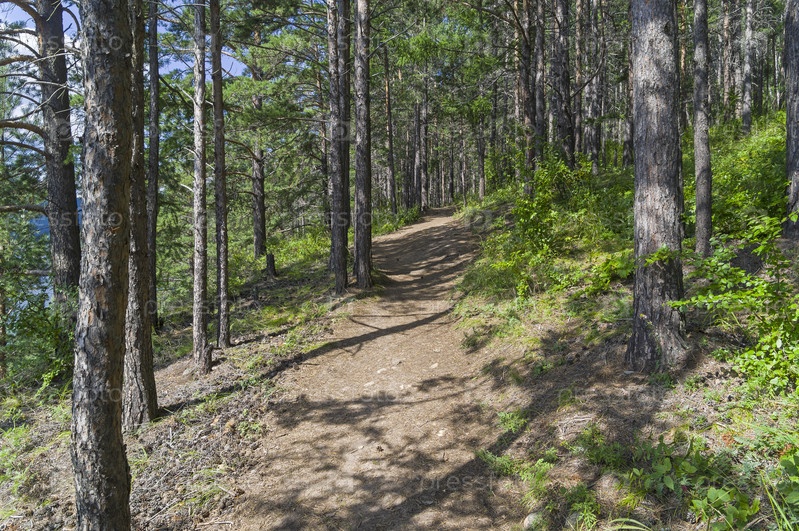Большая Байкальская Тропа на лесном склоне на берегу озера Байкал. Окрестности поселка Большие Коты, Прибайкальский национальный парк, Иркутская область, солнечный день в августе