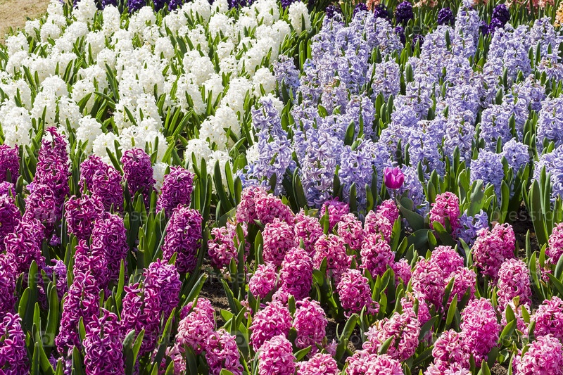 Красивые разноцветные гиацинты под ярким весенним солнцем