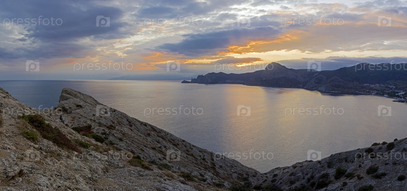 Закат солнца на черноморском побережье Крыма. Вид с вершины мыса Алчак на запад, в сторону Нового Света