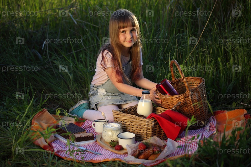 Девочка сидит на поляне. Пикник