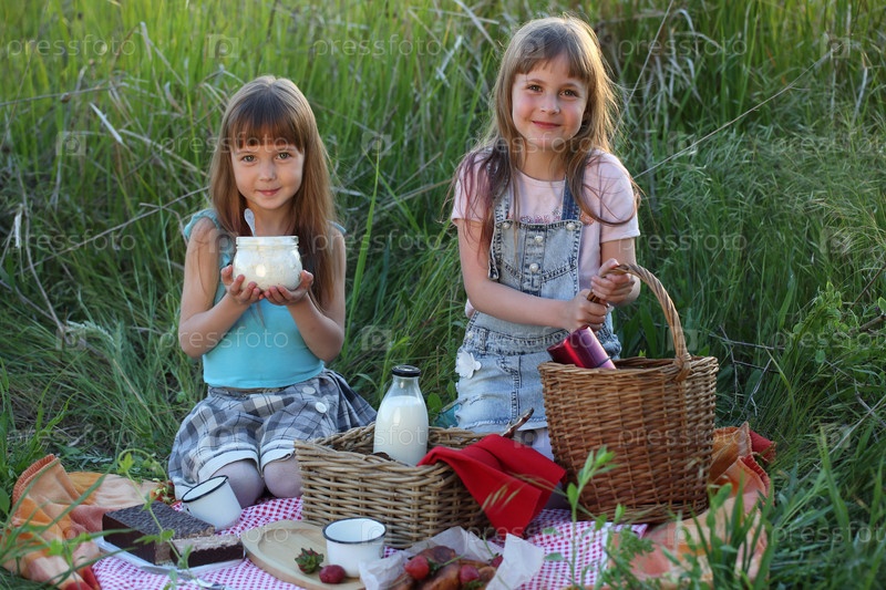 Две девочки сидят на пледе в траве. Пикник