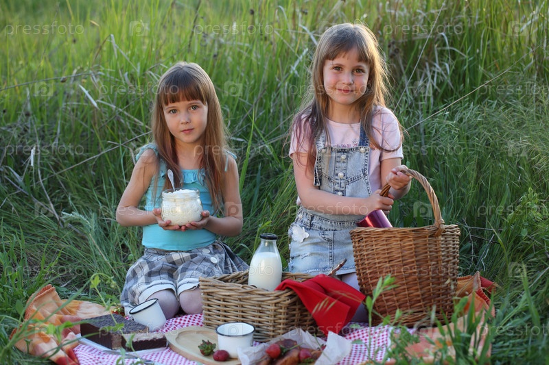 Две девочки сидят на пледе в траве. Пикник