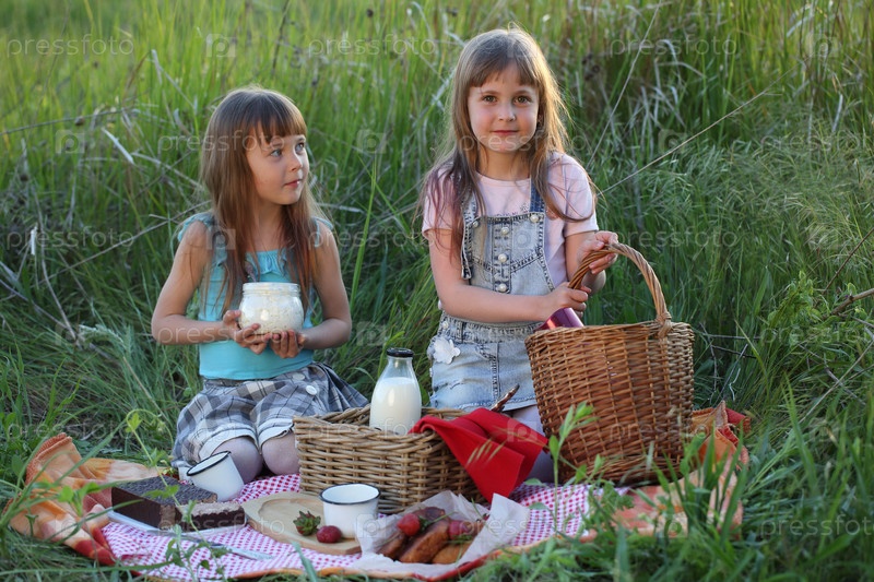 Две девочки сидят на пледе в траве. Пикник