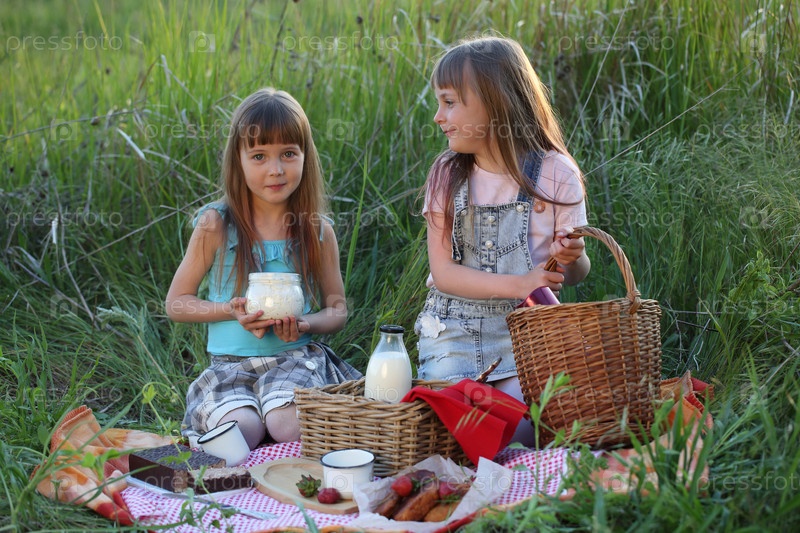 Две девочки сидят на пледе в траве. Пикник