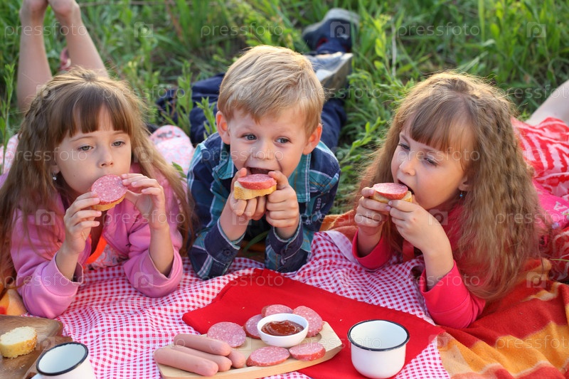 Трое детей на пикнике едят бутерброды с колбасой
