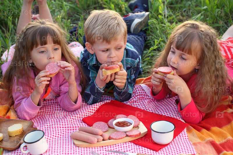 Трое детей на пикнике едят бутерброды с колбасой