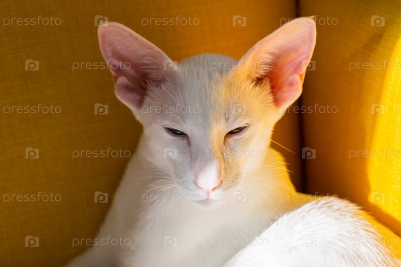 Ориентальный короткошерстный белый котенок с голубыми глазами сидит на желтом кресле