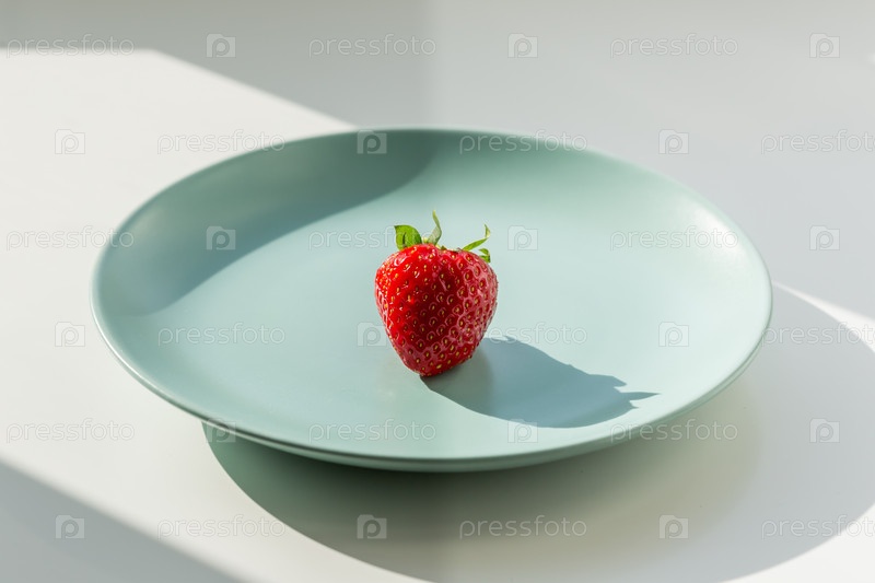 Одна красная клубника на зеленой тарелке. Концепция здорового образа жизни