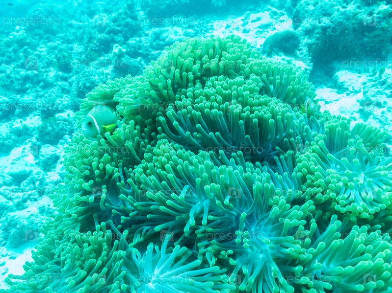 Рыба-клоун в морском анемоне в глубинах Индийского океана, Мальдивские острова