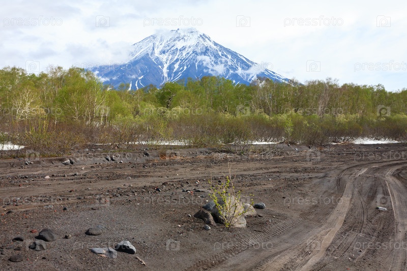 Вид на вулкан Корякский в пасмурную погоду, полуостров Камчатка, Россия