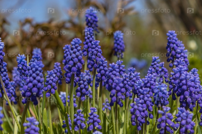 Весной закройте цветки винограда сорта Гиацинт Мускари. Весенние фиолетовые цветы на естественном фоне