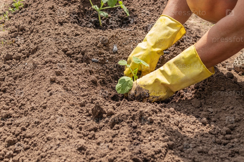 Женщина сажает ростки кабачков на подготовленную грядку. Весна, период сева в сельском хозяйстве