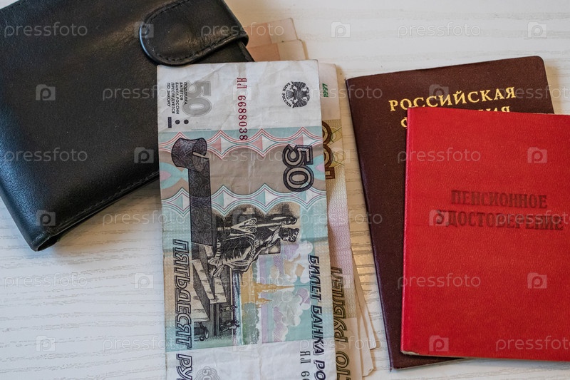 Кошелек, деньги, паспорт и пенсионное удостоверение лежат на столе. Русский перевод: пенсионное удостоверение