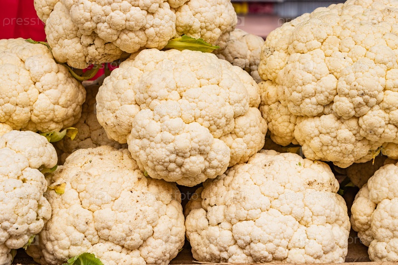 Свежие головки цветной капусты лежат на прилавке крупным планом. как фон