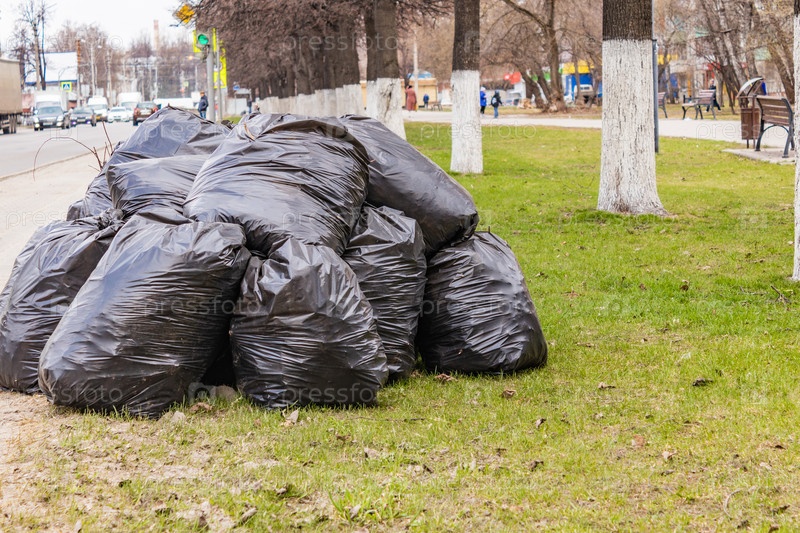 Черный полиэтиленовый пакет с собранным мусором на зеленой лужайке. Сбор мусора весной на улицах. Тула, Россия