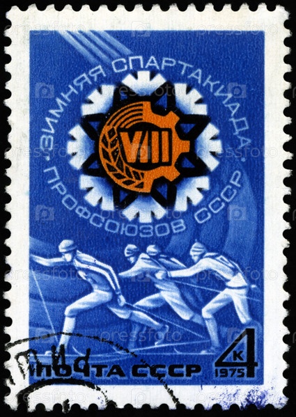 Марка СССР 1975 года. Бегущие лыжники. Зимние игры советских профсоюзов, серия