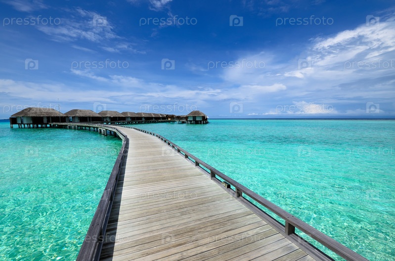 Красивый пляж с водными бунгало