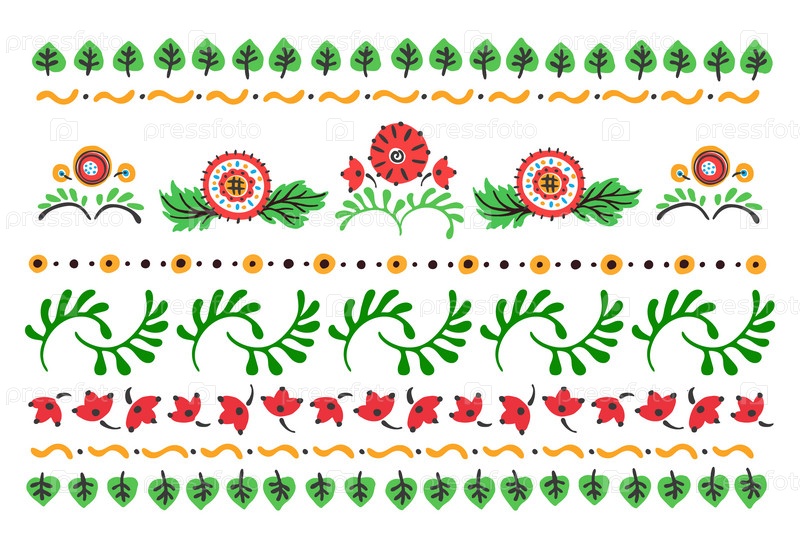Набор этнических элементов. Бордюр представляет собой полосу с цветами, листьями, ветками, вензелями. Народная вышивка. Славянский, украинский, русский мотив. Хохлома, матрешка, дымковская игрушка. Мексиканский, индийский, цыганский ковер. Вязаное кружево